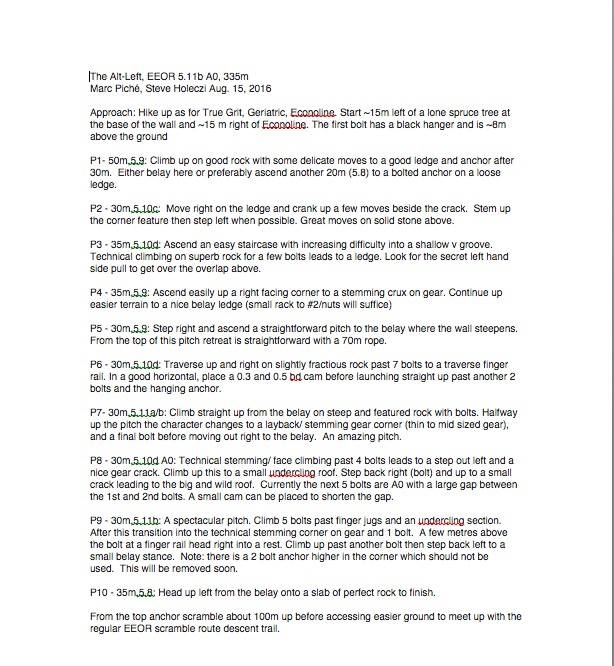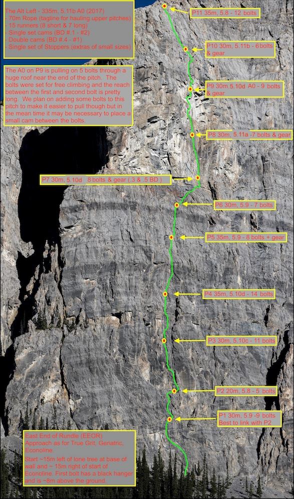 We are pleased to announce that Canmore-local, Marc Piche has released the topo for a new line he completed with Steve Holeczi called The Alt Left (5.11b AO, 335 meters) found on the EEOR (East End of Rundle).